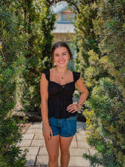 "Amelia" Black Ruffle Trim Front Tie Shirred Waist Blouse
