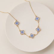 Delicate and elegant, our Blue Floral Mother of Pearl Necklace features six clover-shaped charms inlaid with shimmering mother of pearl, overlaid with a soft blue floral design. Each charm is framed in a textured gold-tone bezel and linked along a fine, adjustable chain. Inspired by heirloom tilework and timeless botanical patterns, this necklace offers a graceful blend of vintage charm and modern minimalism. Perfect for layering or wearing solo, it’s a standout piece for any season.