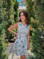 This floral dress features a high neckline and a fitted waistline, with a flowing silhouette and a sash tie back. Made of 65% cotton and 35% polyester.