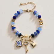 Add a pop of personality to your jewelry collection with this playful beaded charm bracelet featuring vibrant glass beads and whimsical gold-tone charm trios. Each bracelet offers a unique set of charms—from lucky symbols and faith icons to fruits, flowers, and keys—perfect for expressing your mood or style. With an adjustable gold chain for the perfect fit and rich color combinations ranging from soft neutrals to bold rainbows, this bracelet is designed to complement any outfit. Whether you're stacking it with others or letting it shine on its own, this charm bracelet brings joy, meaning, and sparkle to every look. Product Features: * Materials: Multicolor Glass Beads, Zinc Alloy, Enamel, Faux Pearls * Charms: Choose from combinations like Cross and Gem, Lock and Key, Hamsa and Evil Eye, Cherries and Flowers, and more * Fit: Adjustable with lobster clasp (One Size Fits Most) * Style: Boho, playful, modern * Unisex design: Great for women, teens...