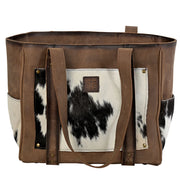 The Cowhide Trinity Tote is made from hand selected hair on hide with genuine full grain leather accents.