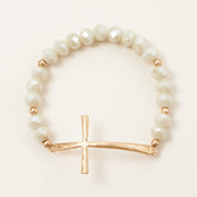 This Glass and Metal Beaded Stretch Bracelet with hammered metal cross shaped charm adds a touch of elegance to any outfit. With its stretch design, it offers a comfortable fit for all wrist sizes. Perfect for everyday wear or special occasions.