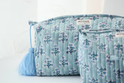 ✤ ✤ ------------✤ ✤ ✤--------------✤ ✤ Gorgeous hand block printed quilted travel bag. Designed for practicality, our travel bag comes with a waterproof lining, ensuring that your belongings remain protected from unexpected spills or the elements. This travel bag is machine washable, allowing for quick and hassle-free cleaning. Tumble dry on low, and it's ready for your next adventure. Gets softer with every wash. ✤Due to the handmade nature of the print, small beautiful irregularities are natural and adds to the organic beauty of the product✤ - Large pouch is 10”x 4.5”x 4” Makes an amazing gift! ✤ ✤ ------------✤ ✤ ✤--------------✤ ✤