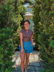 Featuring a distinctive tiered or ruffled style. A fitted yoke sits high on the waist and hips, defined by a prominent four-button fly with round, light brown, wood-like buttons. From the yoke, a gathered panel of denim flares out, creating a wide, floaty leg opening that gives the shorts a skirt-like silhouette. The shorts are made from a soft, light-blue denim and feature vertical seam detailing on the front panels. The hem is finished with a wide, stitched cuff.