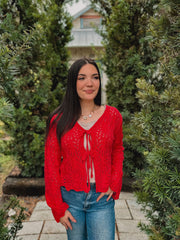 This cardigan features a unique front tie design and delicate scallop detailing, all expertly knitted for a stylish and comfortable fit.