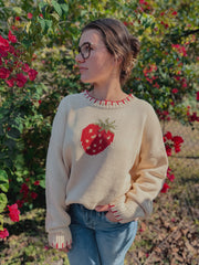 Get cozy with the "Jeanette" Long Sleeve Strawberry Sweater. This knitted sweater features a slouchy fit and a round neck for ultimate comfort. Perfect for cooler days, the long sleeves will keep you warm and stylish. Say hello to your new go-to sweater!