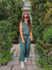 Drawstring waist sleeveless knit active jumpsuit. This comfortable and stylish jumpsuit is designed with a drawstring waist for an adjustable fit and features a sleeveless design that’s perfect for warmer weather or layering. Made from soft, breathable knit fabric, it’s ideal for casual outings, workouts, or lounging. The active jumpsuit offers a relaxed yet flattering silhouette, making it a versatile addition to your wardrobe.