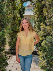 "Lily" Yellow Lace Trim Front Tie Ruffle Sleeve Top