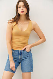 Elevate your everyday wardrobe with this versatile gold tank that combines timeless style with modern comfort. Crafted from a soft, stretchy jersey blend with spandex, it hugs your curves beautifully while providing the flexibility you need to move freely. The flattering V-neckline frames your face from front and back, while double lining ensures confidence all day long. Perfect as a standalone piece or layered under your favorite jacket, this sleeveless essential delivers classic sophistication in a slim fit that flatters. Available in plus sizes to celebrate every body.