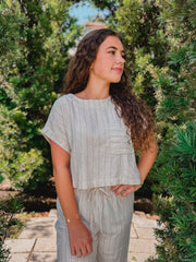 This cropped woven top features a round neckline, short cuffed sleeves, and a stylish back button detail with non-functional buttons. The front pocket adds a charming touch to its pinstripe linen blend fabric. Made from 78% rayon, 20% linen, and 2% polyester, this unlined piece offers breathable comfort and effortless style.