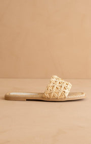 Experience expert craftsmanship with "Natasha" Natural Raffia Slides. Artisanal raffia is intricately woven into a bold basket-inspired design, combining luxurious texture with effortless flair. Complete with the iconic DreamCloud cushioned sole for ultimate comfort all day long. Materials: * Upper Material: Raffia Upper * Insole Material: DreamCloud Cushion * Sole or Heel Material: Rubber Outsole Details: * Brand: Oasis Society * Heel Height: 0.50''