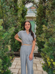 “Vivian”Grey Collared Short Sleeve Wrap Crop Top
