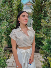 “Vivian” Khaki Collared Short Sleeve Wrap Crop Top