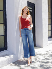 These high-rise wide-legged jeans offer a comfortable stretch denim fit, featuring a 10 ½" rise and a 28" inseam that hits at the ankle. Designed with distinctive pink tuck details and a tailored trouser hem, they combine style and ease for a standout look. The wide leg opening measures 21", providing a flattering silhouette that’s both modern and versatile.