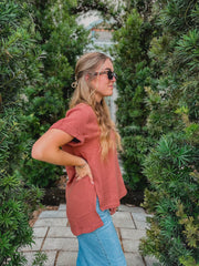Embrace a fresh mood for spring in our Trudie Top crafted from cotton gauze, this dreamy v-neckline short sleeve, side slits, and raw edge detailing that is comfortable and seriously chic.