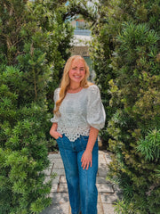 "Darla" White Lace Cutout Bubble Sleeve Top