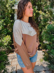 This lightweight pullover features a stylish tan and cream color block design, crafted from a comfortable blend of 60% polyester and 40% cotton. Perfect for adding a cozy yet fashionable layer to your wardrobe.