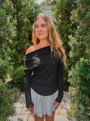 Lula Thermal Top features an off-shoulder neckline, a snug, figure-flattering fit, and raw edge detailing.