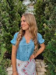 This cropped chambray woven top features a V neckline and button-down front, complemented by short puff sleeves and a delicate floral embroidery design. Made from 100% lyocell, it offers a lightweight, breathable feel without lining, perfect for stylish comfort.