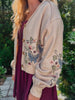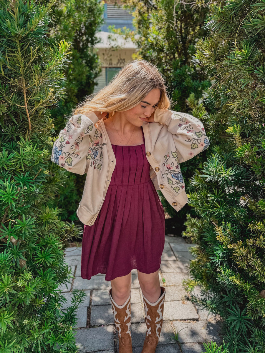 This charming embroidered cardigan is crafted from a soft cotton blend with a brushed interior for added comfort. It features intricate cross-hatched floral embroidery, elegant round tortoise buttons, and ribbed trim for a polished finish.
