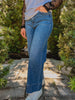 These high-rise wide-legged jeans offer a comfortable stretch denim fit, featuring a 10 ½" rise and a 28" inseam that hits at the ankle. Designed with distinctive pink tuck details and a tailored trouser hem, they combine style and ease for a standout look. The wide leg opening measures 21", providing a flattering silhouette that’s both modern and versatile.