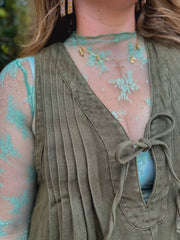 “Fawn” Floral Lace Sheer Mesh Layering Top In Sage
