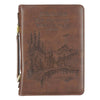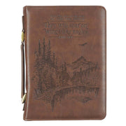 The rugged wilderness scene depicted on the On Wings Like Eagles Brown Faux Leather Classic Bible Cover sets a peaceful tone both visually and spiritually. It is a reminder that trusting in the LORD gives strength and renews the spirit. As spending time in the great outdoors renews the mind and body, so our hearts are renewed when we spend time with the LORD, and this handsome Bible cover will protect your Bible no matter where your travels take you. Heat-debossed soaring eagle, mountain, and pine forest design, Brown faux leather, Heat-debossed text, Those who hope in the Lord will renew their strength. They will soar on wings like eagles., Isaiah 40:31, Soar Collection, Classic Bible Cover, Back slip pocket, Lay-flat faux leather carry handle, Antique gold metal handle hardware, Antique gold metal cross-engraved zipper pull,  2 interior pen loops , Available in medium, large and extra-large, Refer to Image Carousel for Bible Cover Sizing Chart,