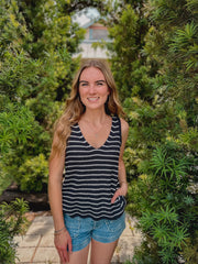 This lightweight sweater tank features a striped pattern and a flattering V-neck racerback design, perfect for comfortable, stylish layering.