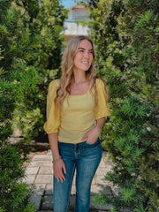 this super comfortable and versatile top features a fitted bodice with a puff sleeve detail