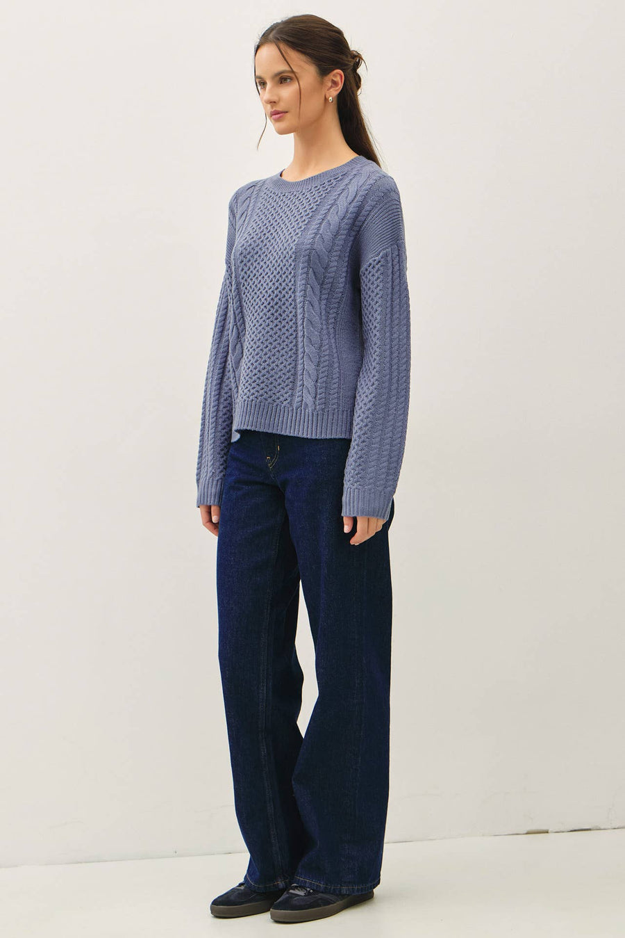 Wrap yourself in timeless comfort with this cable knit crewneck sweater. Featuring a soft, touchable fabric and classic drop-shoulder silhouette, it's designed for effortless style. The relaxed, oversized fit flatters every frame while the long sleeves and round neckline deliver that cozy, put-together look you'll reach for again and again. Perfect for layering or wearing solo, this wardrobe essential combines quality craftsmanship with everyday wearability.