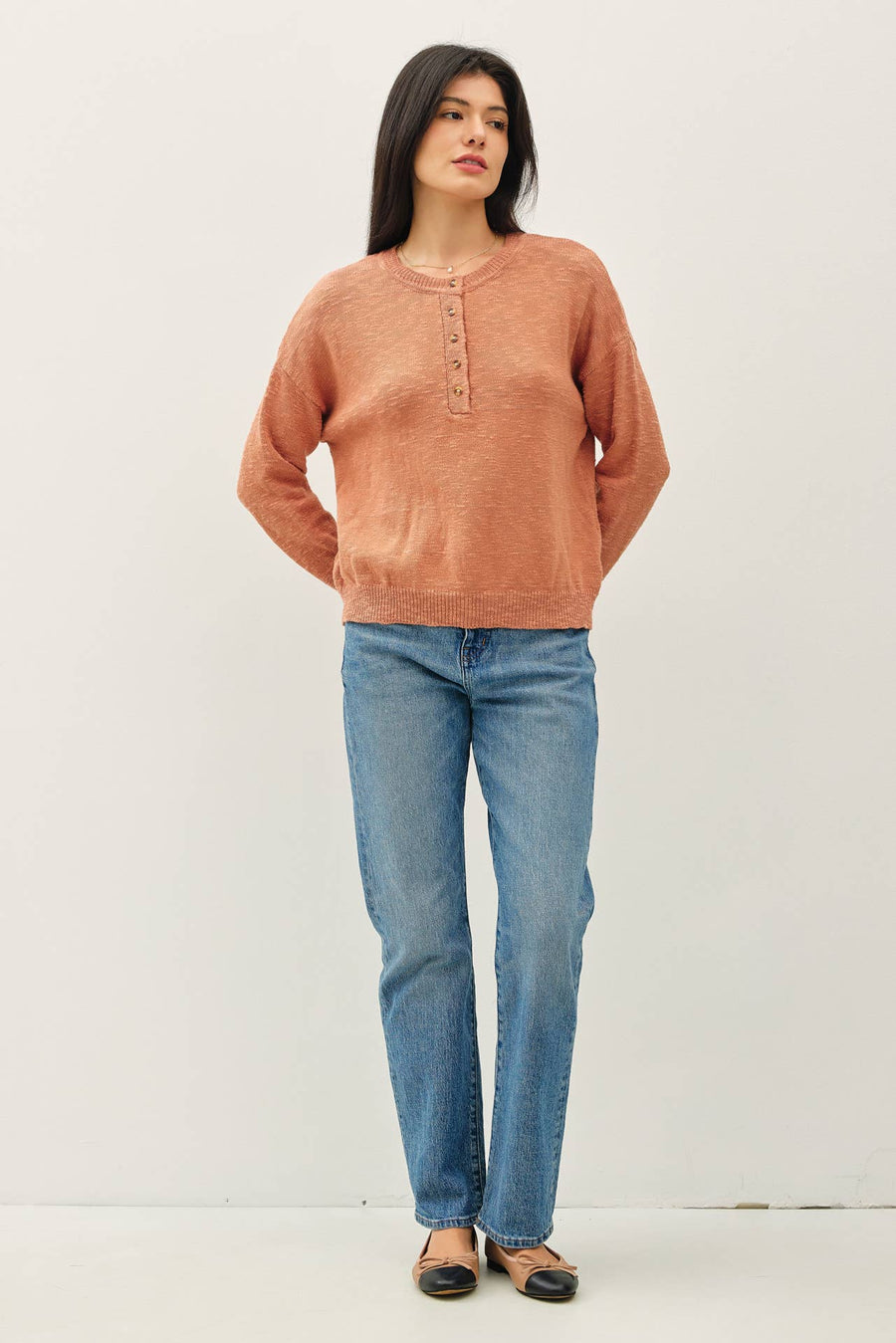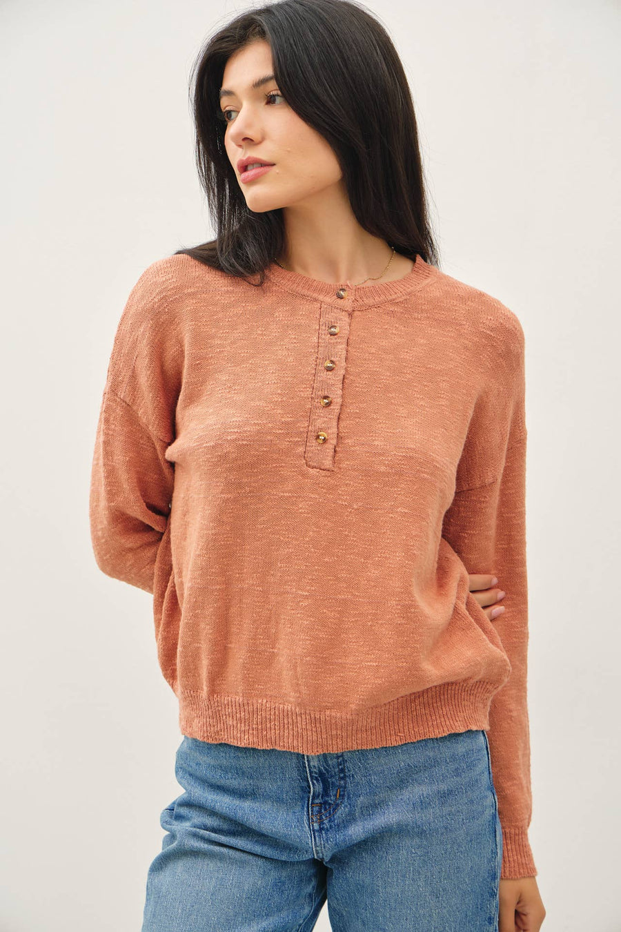 Discover effortless style with the "Massie" Cotton Slub Henley Top, designed for everyday comfort and versatility. This relaxed-fit piece features a classic crew neckline, functional button placket, and flattering drop shoulders that work beautifully with any wardrobe. Crafted from soft cotton slub yarn for natural texture and breathability, the above-hip length silhouette pairs seamlessly with your favorite jeans or layered pieces. Long sleeves provide year-round wearability, making this henley an essential staple you'll reach for again and again.