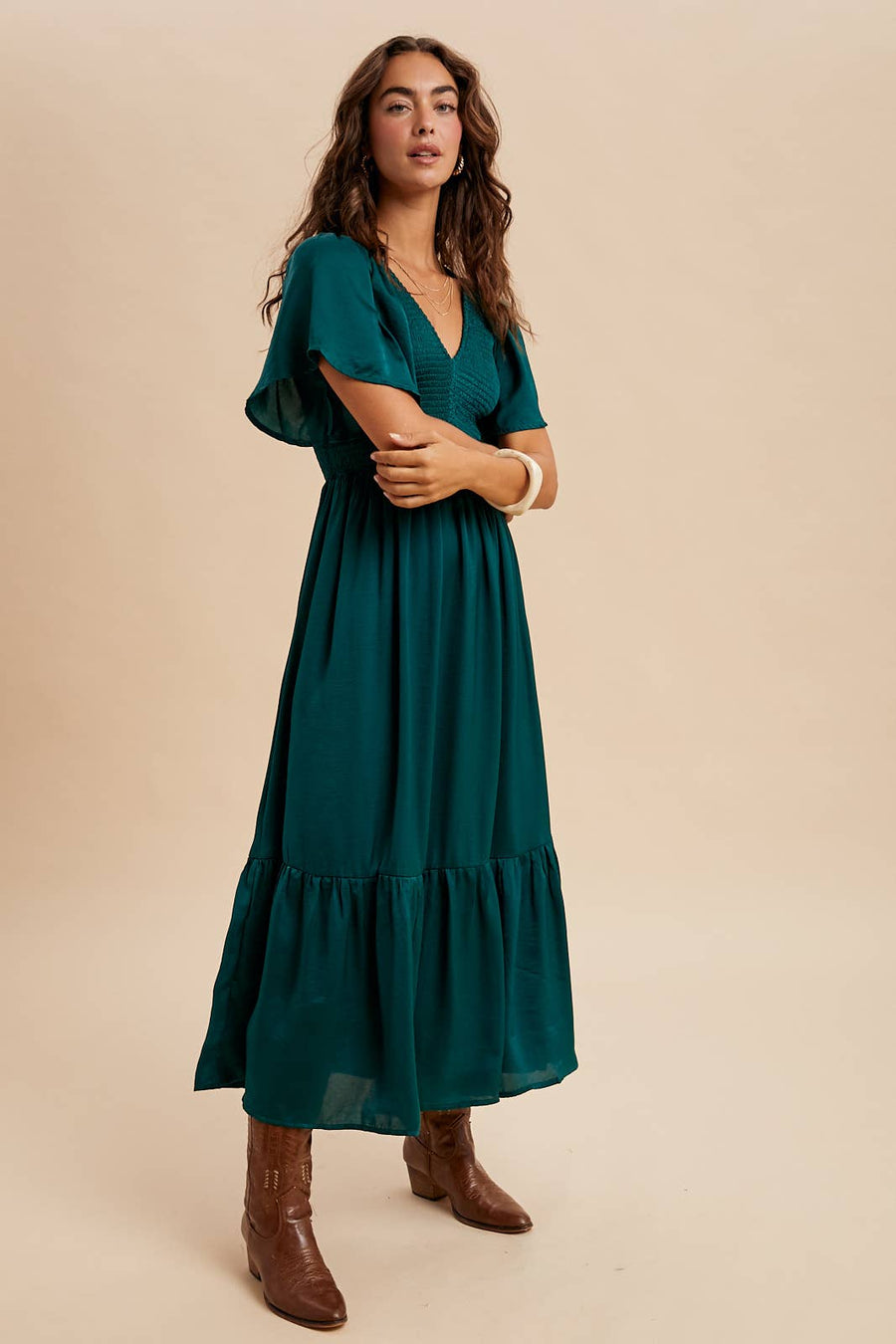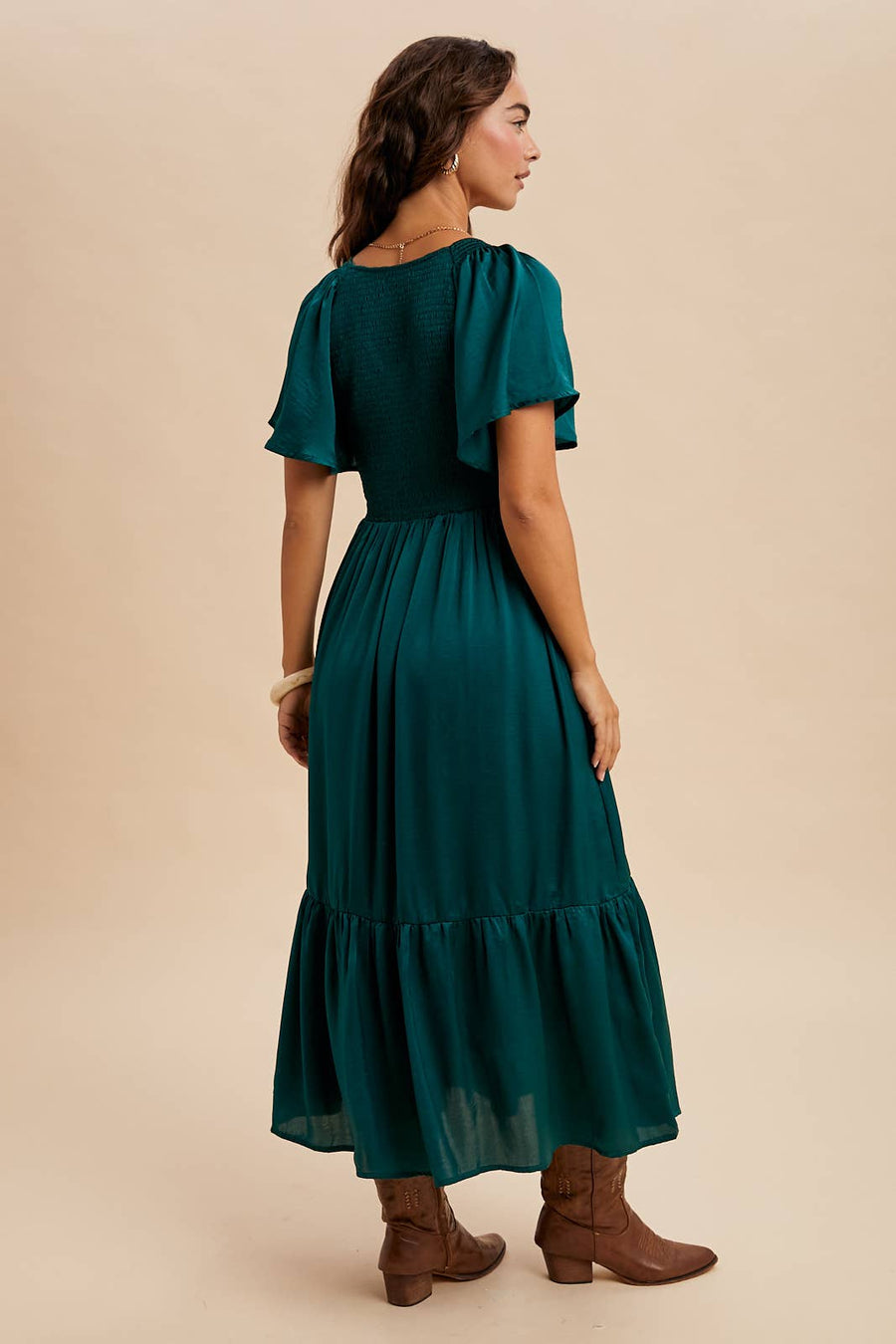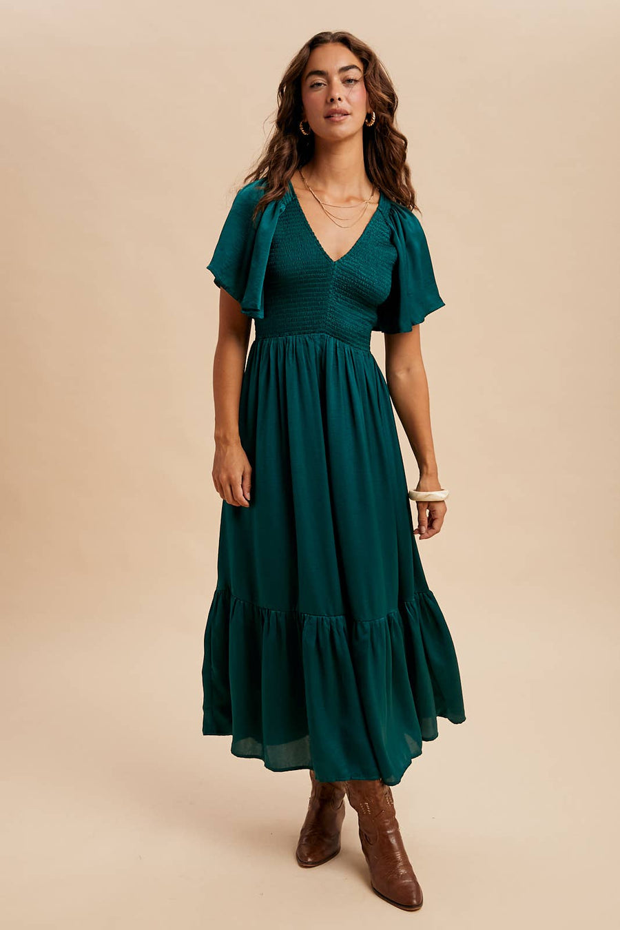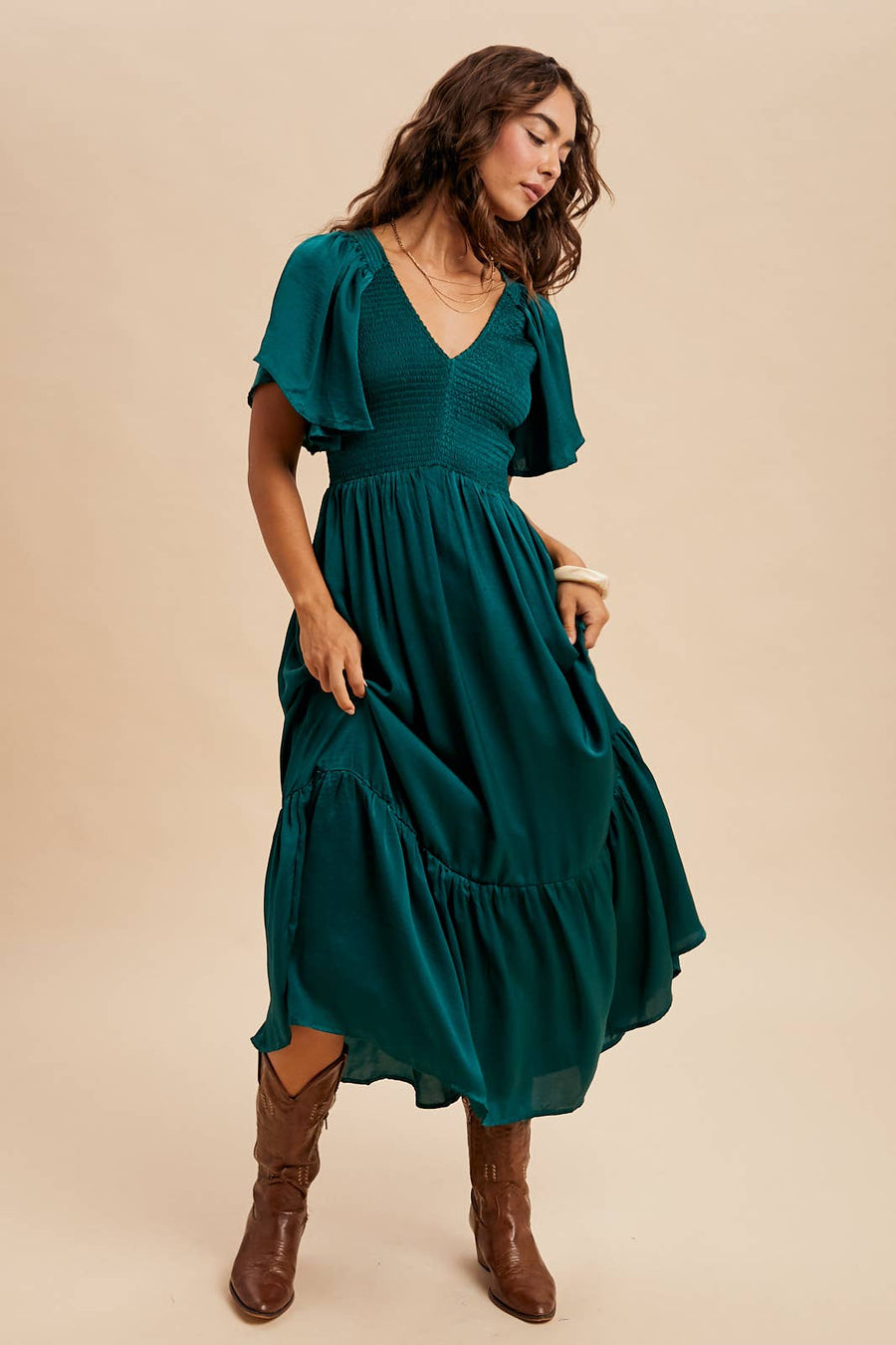 Zoom "Faye" Smocked Satin Midi Dress in Emerald