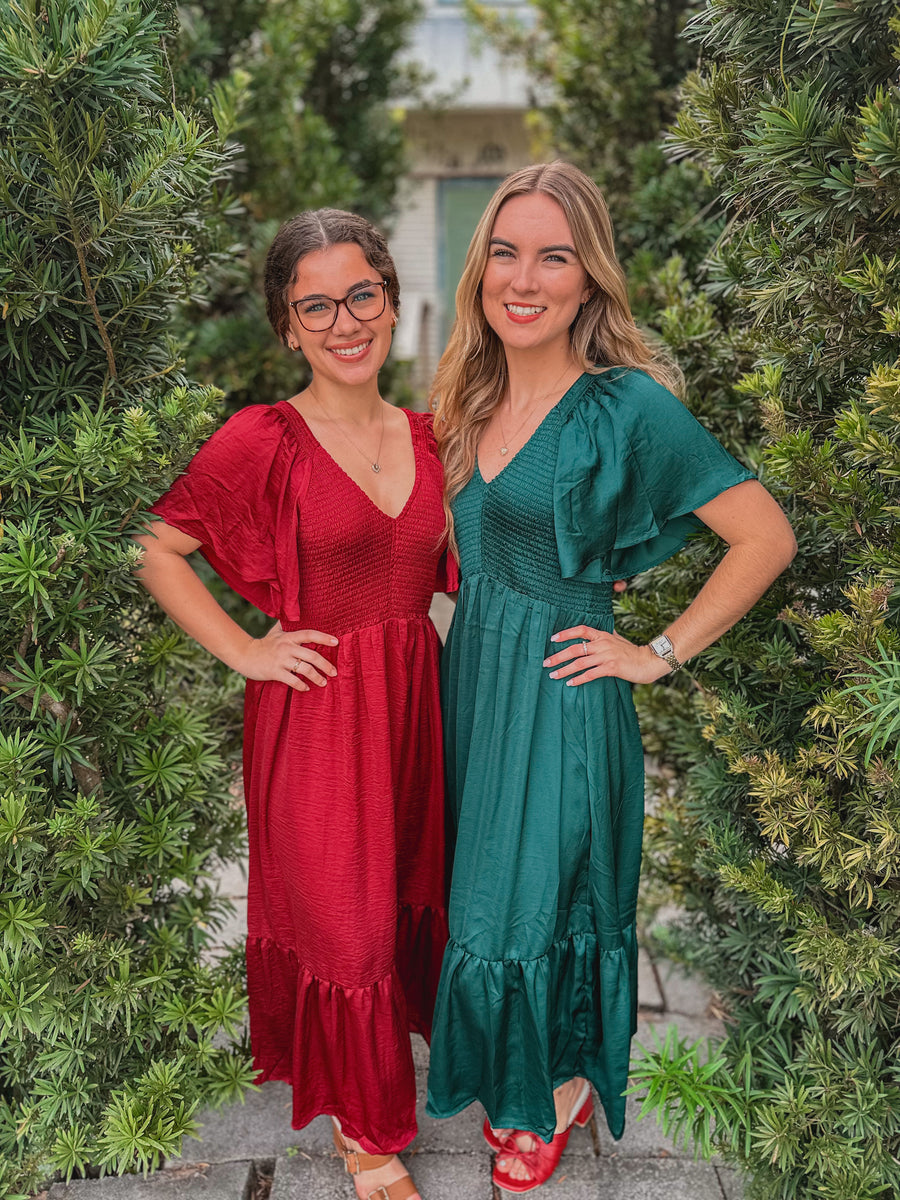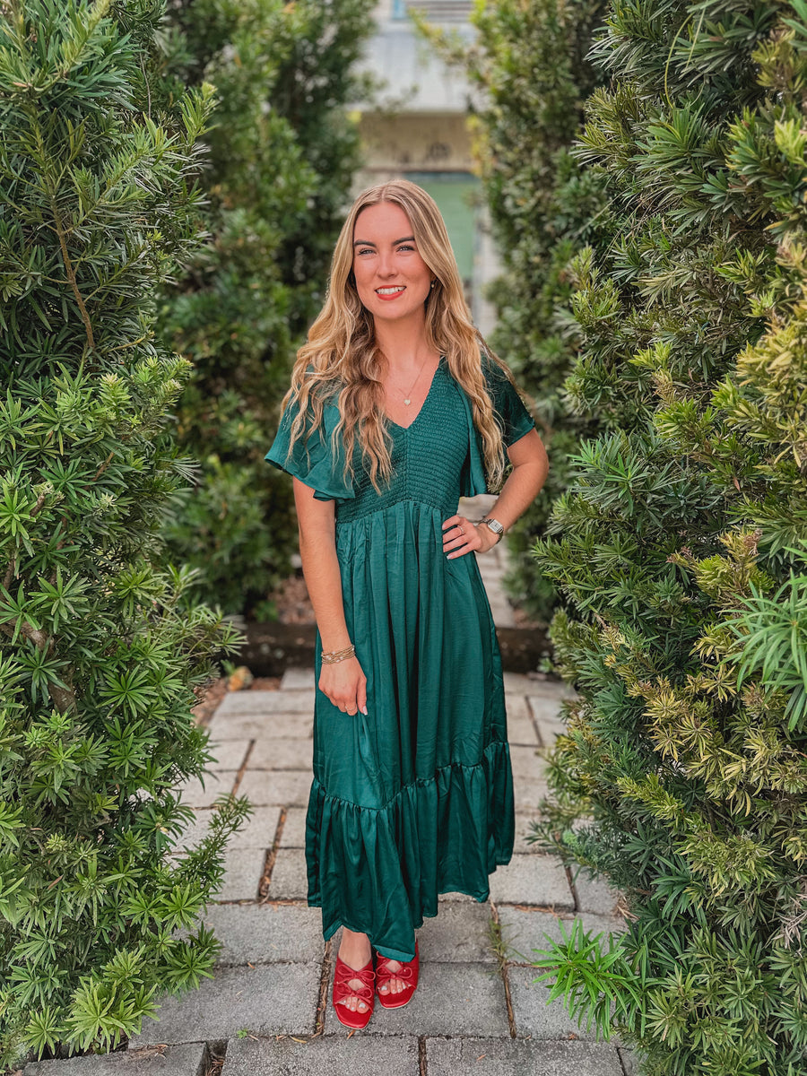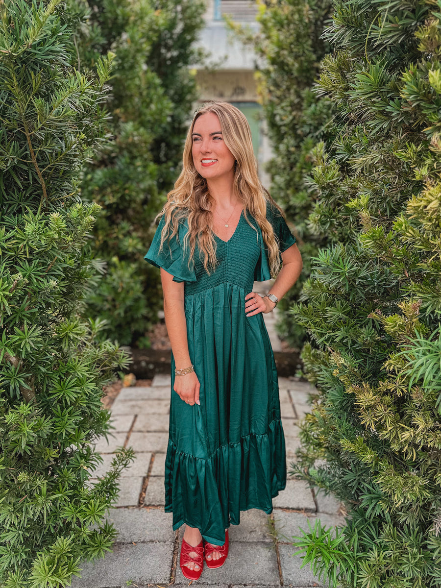 "Faye" Smocked Satin Midi Dress in Emerald