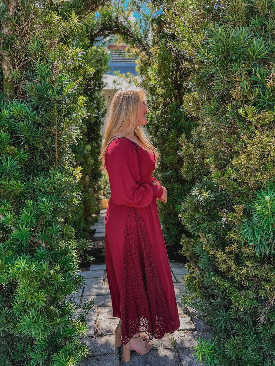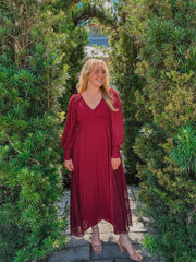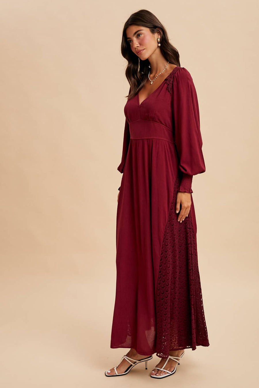 Don’t overlook the exquisite details of this stunning dramatic maxi dress! Crafted from soft rayon, it showcases a V neckline and raglan lace panel sleeves with smocked cuffs. The skirt features a delicate lace panel, complemented by a deep keyhole back adorned with decorative buttons. A smocked waistband provides a flattering fit, and the dress includes a full lining for comfortable wear.