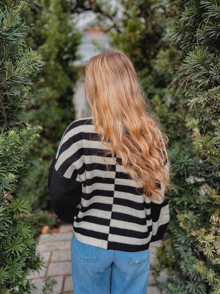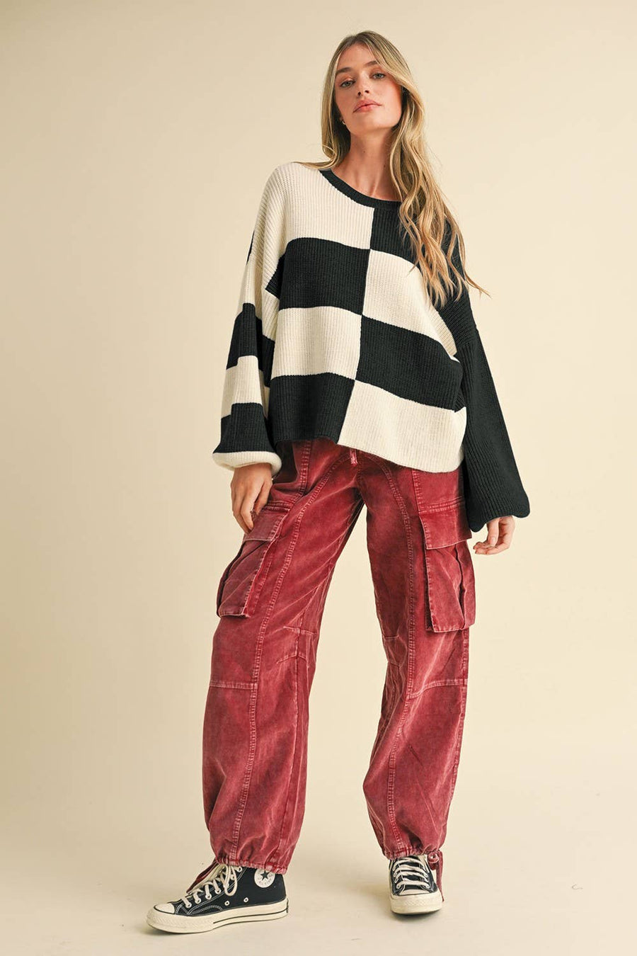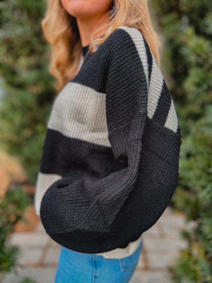 Embrace effortless style with this stunning oversized pullover that combines comfort and contemporary design. The mixed color block knit creates visual interest, while the drop shoulder silhouette and balloon sleeves deliver that coveted relaxed-fit aesthetic. Finished with a classic ribbed crew neckline and cuffs for structure, plus a unique striped knit detail on the back that adds dimension to every angle. Perfect for layering or wearing solo, this sweater transitions seamlessly from casual days to cozy evenings.