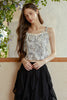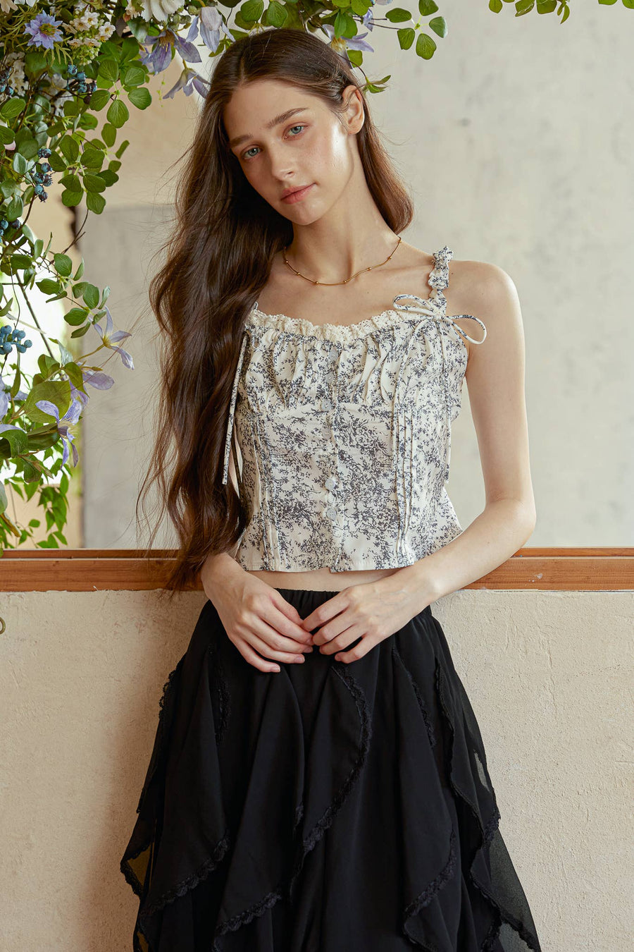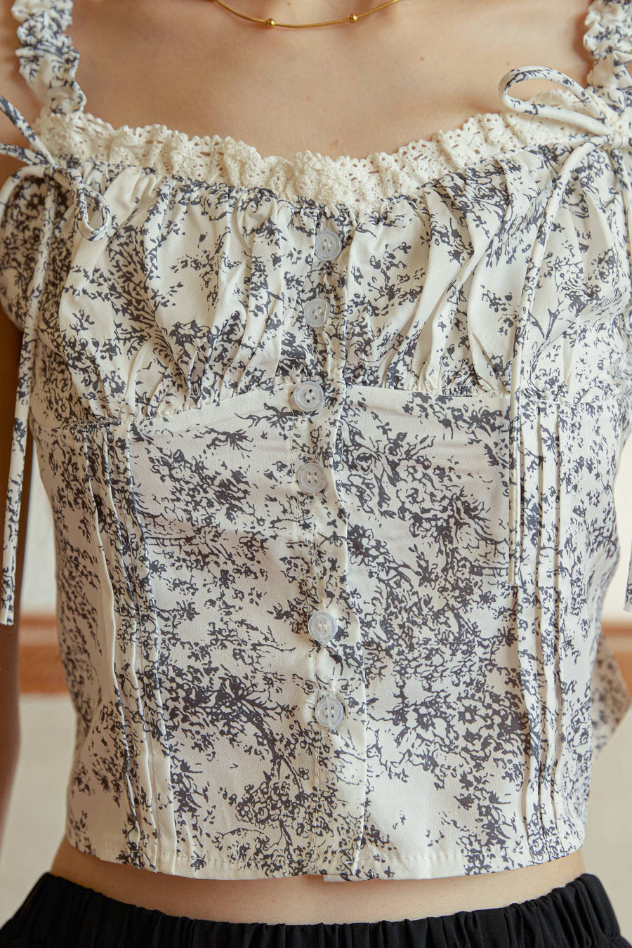 This elegant black toile print top brings timeless sophistication to your wardrobe. The cropped silhouette flatters your figure, while delicate ruching at the bust adds dimension and visual interest. Charming front buttons and ruffled straps adorned with bow details create a romantic, feminine aesthetic perfect for dressing up or down. Crafted from 100% polyester, it's easy to care for and designed to maintain its shape and vibrant print through countless wears.