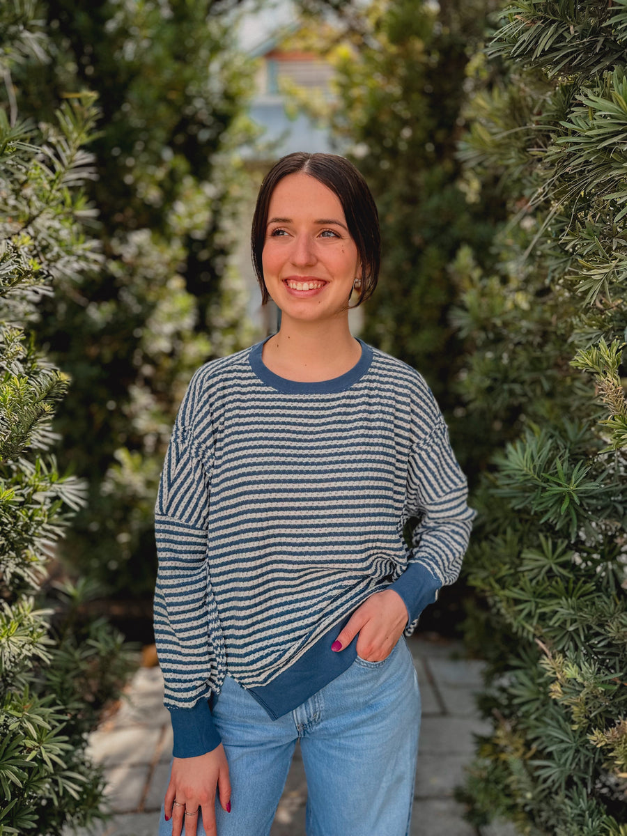 Effortlessly chic and undeniably comfortable, the Rowyn striped knit top combines timeless style with modern ease. Featuring a relaxed silhouette with drop shoulders and a charming split hem, this piece transitions seamlessly from casual days to weekend outings. The classic stripe pattern adds visual interest while the round neckline keeps things approachable. Crafted from a breathable cotton-polyester blend with spandex-enhanced contrast details, it moves with you all day long. A wardrobe essential that delivers both versatility and comfort.