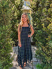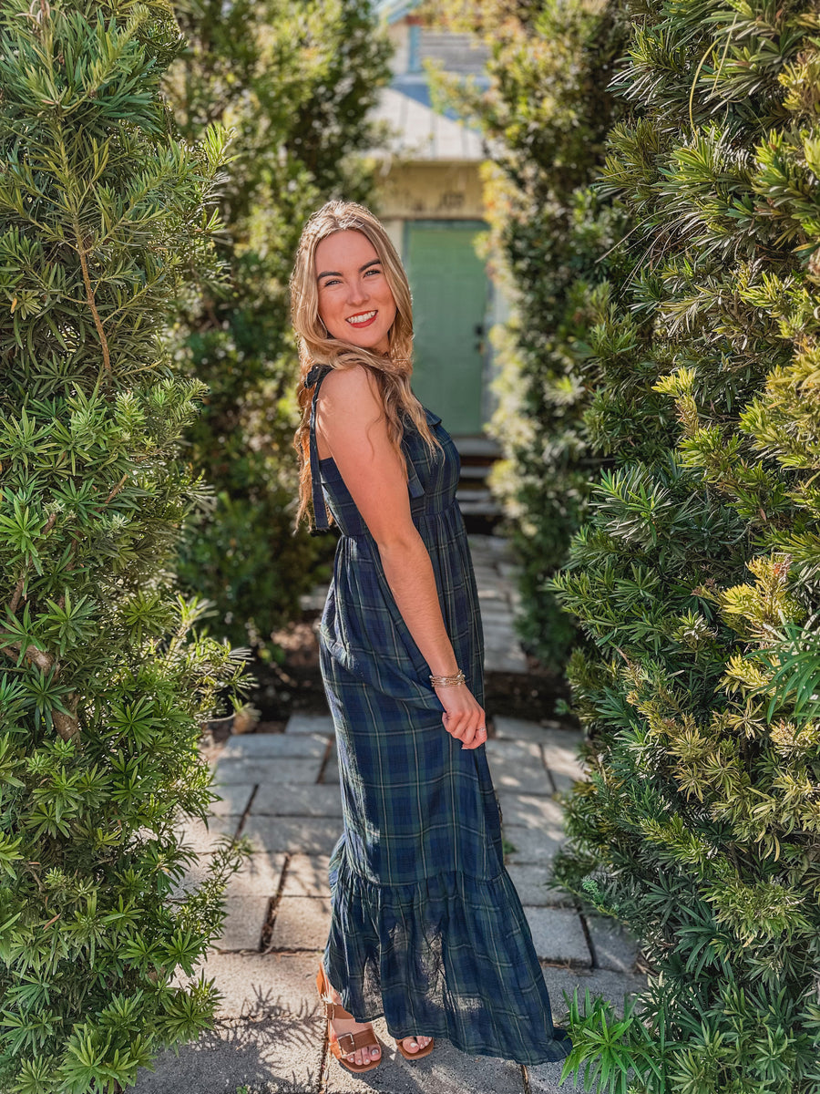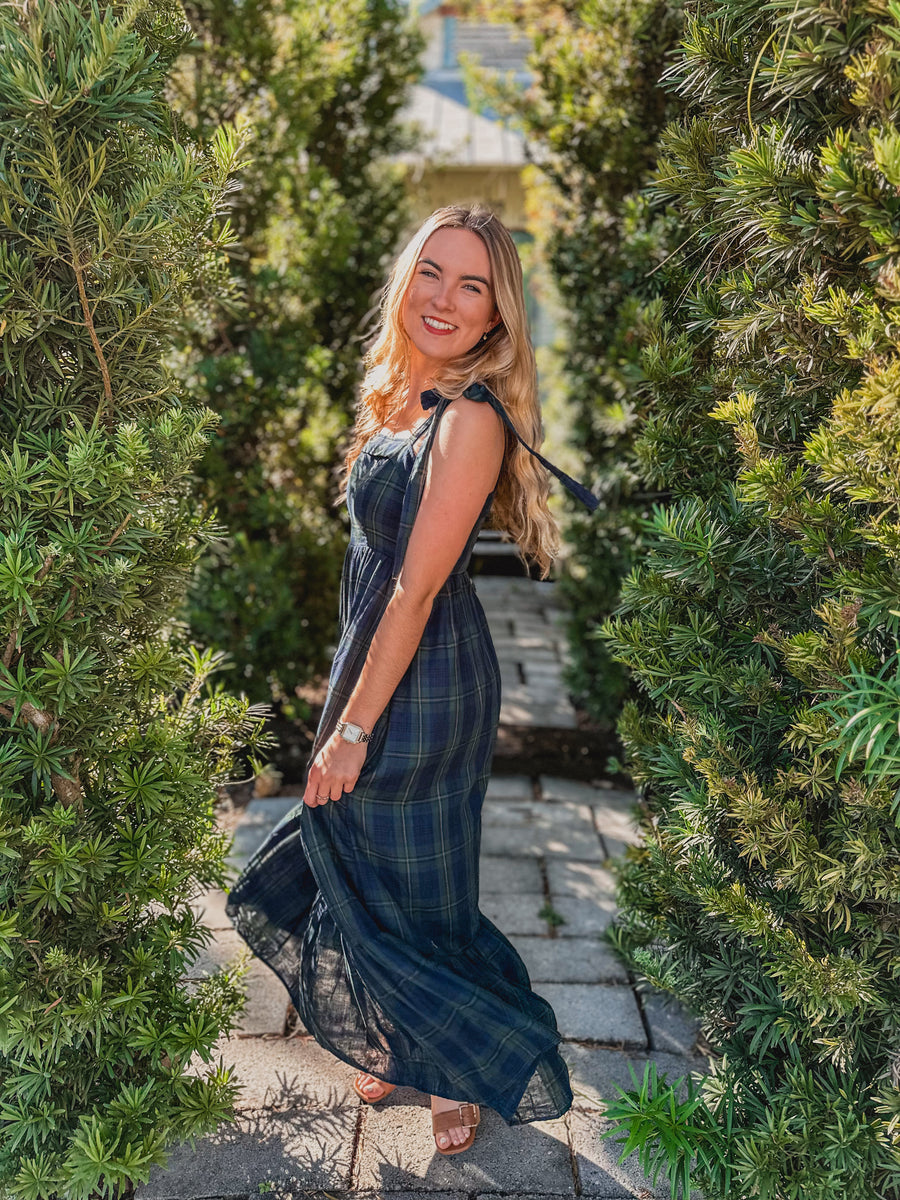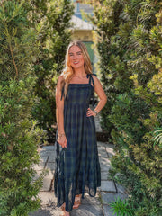 The "Alani" Midnight Tartan Maxi Dress is crafted from soft cotton tartan plaid and showcases adjustable self-tie shoulder straps for a perfect fit. It features a partially smocked back, convenient side pockets, and a flounced hem for added movement. With a hidden side zipper and full lining, this maxi dress offers both comfort and style effortlessly.